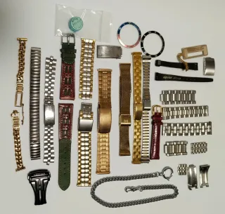 LOTE DE FORNITURA VARIADO ▪️Correas piel y acero ▪️Biseles ▪️Cierres y hebillas ▪️Eslabones de pulsera ▪️Leontina ▪️Rueda escape