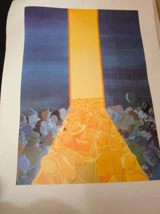 Cartel litografía con un diseño llamativo. 85x62 - Representación de una multitud bajo un haz de luz. - Tonos azules y amarillos predominantes. Artistas Daniel torres litografia original editada por la famosa imprenta ibero suiza.