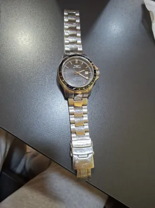 Elegante reloj Sandoz Geneve con brazalete de acero inoxidable. Un accesorio clásico y funcional. - Esfera gris. - Bisel con detalles dorados. - Resistente al agua 100m / 330ft. - Cierre desplegable.