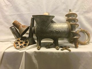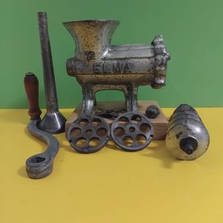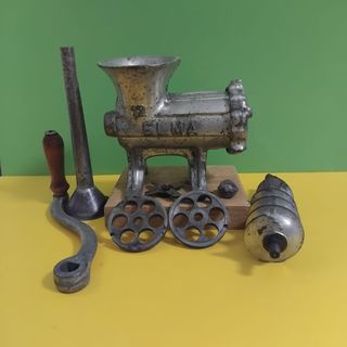 Picadora de carne manual antigua de la marca ELMA, modelo 12. Ideal para coleccionistas o para uso decorativo. Fabricada en hierro fundido con un baño electrolítico para mejor resistencia. Incluye accesorios. Tal cual se muestra en las imágenes Más artículos en mi perfil***