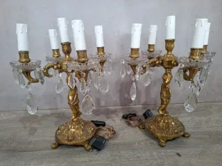 Elegante pareja de candelabros de bronce con detalles de cristal. - Diseño clásico con figuras de querubines. - Cristales tallados colgantes.