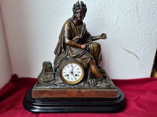 Antiguo reloj de sobremesa de estilo francés, datado en 1830. - Reloj con figura alegórica, posiblemente un filósofo o poeta como Virgilio. - Fabricado en bronce. - Figura alegórica con corona de laurel. - Base de mármol y madera.