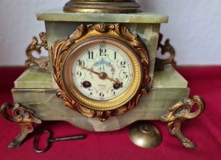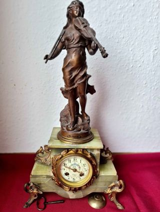 Elegante reloj de chimenea de estilo Art Nouveau. La base está elaborada en ónix verde y presenta una figura decorativa de bronce de una mujer tocando el violín. - Base de ónix verde. - Figura de bronce de músico. - Marco del reloj dorado.