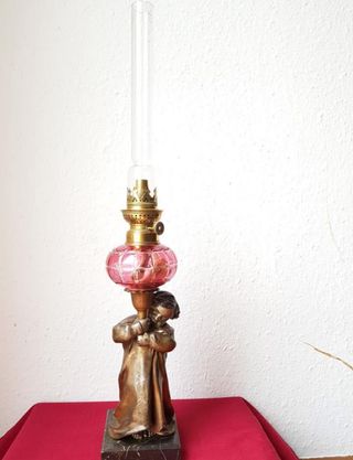 Elegante lámpara de aceite antigua con un diseño de estilo eduardiano. La base presenta una figura de niño en bronce y la parte superior un depósito de cristal rosa facetado. - Base de figura de niño en bronce. - Depósito de cristal rosa facetado. - Quemador y chimenea de latón.