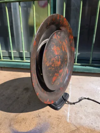 Altavoz de radio Philips de 1926. Pieza de colección con un diseño distintivo. - Material: Baquelita con motas rojas y negras. - Diseño circular concéntrico.