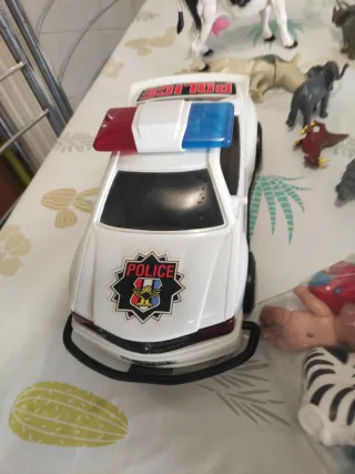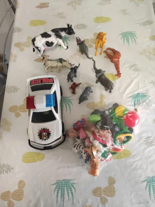 Lote variado de juguetes y muñecos. - Incluye animales de plástico como vacas, rinocerontes, elefantes, jirafas y guepardos. - También se incluye un coche de policía de juguete. - Varios muñecos pequeños y accesorios diversos.
