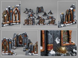 Set de escenografía gótica con un distintivo acabado en mármol verde abisal. Ideal para crear ambientes de batalla únicos. - Piezas de ruinas góticas. - Detalle en mármol verde abisal.