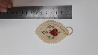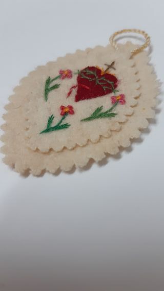 Pequeño Detente religioso bordado a mano, sobre fieltro blanco, con el Sagrado Corazón de Jesús. - Diseño ovalado con borde festoneado. - Bordado de hilo rojo para el corazón y detalles en verde y rosa. - Incluye asa para colgar.