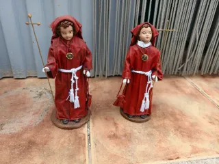 Conjunto de dos figuras de nazarenos, ideales para coleccionistas o belenes. - Figuras de nazarenos. - Visten túnicas rojas y cinturón blanco. - Cada figura porta una cruz dorada.