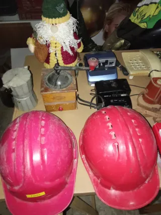 Lote variado de artículos vintage y electrónicos. - Cafetera italiana antigua. - Molinillo de café de madera. - Dos cascos de obra rojos. - Cámara de fotos analógica de cuero. - Teléfono fijo beige. - Teléfono fijo blanco. - Teléfono fijo negro. - Receptor de TV digital. - Figura decorativa de mujer. - Muñeco decorativo.