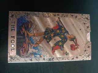 Carta de tarot El Loco con un diseño detallado y un acabado metálico. La ilustración presenta al personaje en una pose dinámica, rodeado de estrellas y elementos decorativos. - Diseño de El Loco. - Acabado metálico. - Ilustración colorida.
