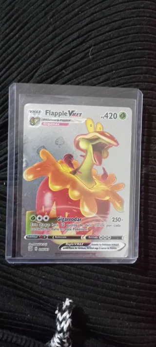 Carta Pokémon de Flapple VMAX, edición Gigamax. - Carta Pokémon: Flapple VMAX - Número de carta: 019/163 - Tipo: VMAX Gigamax - Ataque: Gigarrodar
