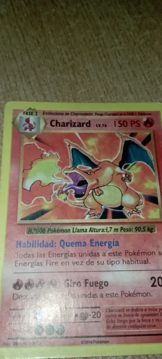 Carta Pokémon de Charizard, Fase 2, número 11/108. - Nivel: LV.76 - PS: 150 - Habilidad: Quema Energía - Ataque: Giro Fuego (200 PS) - Debilidad: x2 - Resistencia: -20 - Ilustrador: Mitsuhiro Arita - Año: ©2014 Pokémon