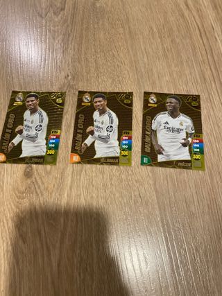 Tres cartas de Balón de Oro de la colección Adrenalyn XL 24/25. Incluyen a los jugadores Bellingham y Vinícius Jr. - Tres cartas Balón de Oro. - Jugadores: Bellingham y Vinícius Jr. - Colección: Adrenalyn XL 24/25.