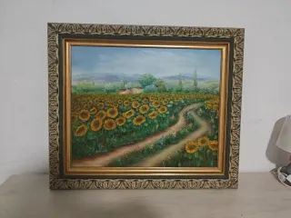 Precioso cuadro pintado a mano de un campo de girasoles con camino. - Firmado por C. Benolt. - Medidas: 50x60 cm.