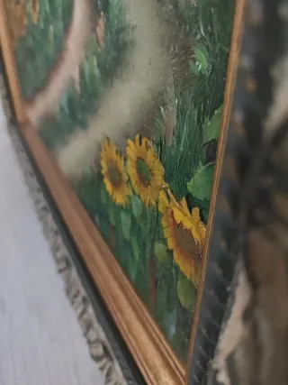 Precioso cuadro con una bonita pintura de flores. El marco es de madera tallada a mano, con un diseño elegante y detallado. Se encuentra en buen estado. - Pintura de flores en tonos cálidos. - Marco de madera tallada. - Estilo clásico y elegante.