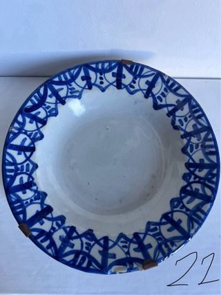 Precioso plato antiguo con un diseño tradicional en azul y blanco. Ideal para coleccionistas o como pieza decorativa. - Borde decorado con motivos geométricos. - Interior en blanco con pequeñas motas.
