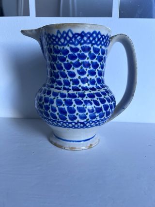 Preciosa jarra antigua de Manises con un diseño floral en azul y blanco. - Decoración pintada a mano. - Motivos florales y grecas. - Asa curva. - Base con detalles en azul.17cm de alto