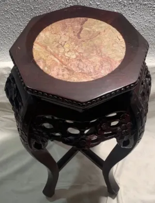 Elegante jarrón alto de estilo oriental, con una base de madera oscura tallada y un detalle superior de mármol veteado. - Base de madera oscura con intrincados tallados florales. - Encimera circular de mármol con vetas rosadas y beige. - Diseño octogonal en la parte superior de la madera.