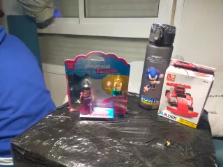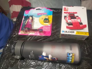 Se vende lote de juguetes que incluye una figura de Playmobil, un coche de construcción y una botella. - Figura de Playmobil Fashion Girls. - Coche de construcción Builder (48 piezas). - Botella de agua temática de Sonic.