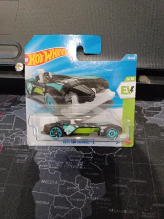 Coche de juguete Hot Wheels, modelo Electro Silhouette. - Es un TH PLATA. - JJM02-N521 - Diseño futurista en negro con detalles en verde y azul. - Número de serie 58/250. - Parte de la serie EV, 5/10. - Año 2026.