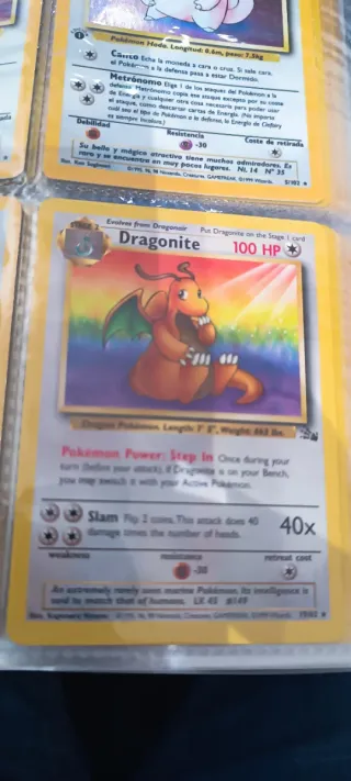 Carta de Pokémon de Dragonite, edición Fossil. 19/62. - Ilustración de Dragonite. - Poder Pokémon: Step In. - Ataque: Slam. - Debilidad y Resistencia indicadas. - Coste de retirada.