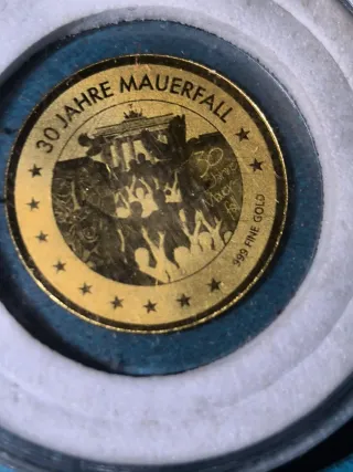 Conmemorativa moneda de oro de 24 quilates. - Diseño especial por el 30 aniversario de la caída del Muro de Berlín. - Grabado 30 Jahre Mauerfall y 999 FINE GOLD. - 1/500 de onza (0,0622 gr)