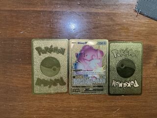 Conjunto de 3 cartas Pokémon doradas. - Carta Blissey V. - Carta Charizard VMAX. - Carta Mareep.