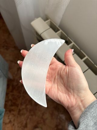 Cuenco decorativo con forma de media luna, hecho de selenita. - Material: Selenita. - Forma: Media luna.