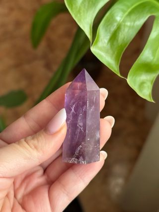 Hermosa punta de amatista con un vibrante tono morado. Ideal para coleccionistas o como elemento decorativo. - Forma de punta hexagonal. - Piedra natural. - Acabado pulido.
