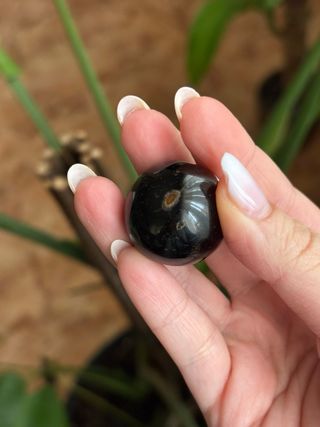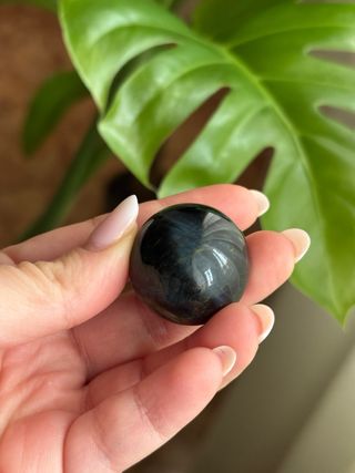 Preciosa esfera de ojo de tigre azul, con un acabado liso y pulido. - Color azul profundo con vetas características. - Forma esférica perfecta.