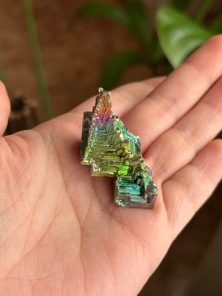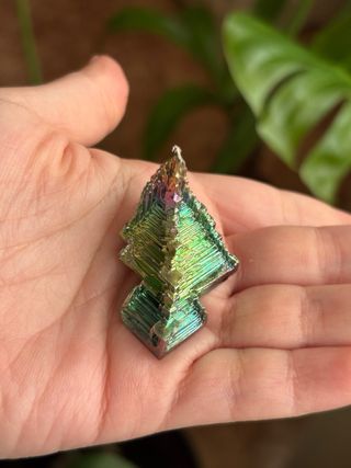 Hermoso cristal de bismuto con un fascinante acabado iridiscente. - Estructura geométrica única. - Colores vibrantes y cambiantes.