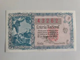 Décimo de la Lotería Nacional para el sorteo de Navidad de 1955. - Número: 43262 - Fecha del sorteo: 22 de Diciembre de 1955 - Precio: 200 ptas. - Serie: 6ª - Sorteo nº: 36