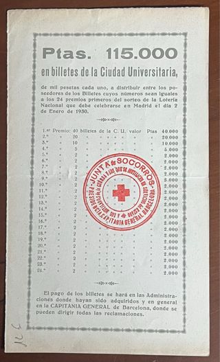 Billete de lotería benéfico español antiguo, especificamente un décimo emitido por la Junta Nacional de Socorros de la Campaña de África, diseñado para recaudar fondos para soldados mutilados e inválidos. - Madrid, 1930 - 12,5x21 cm.
