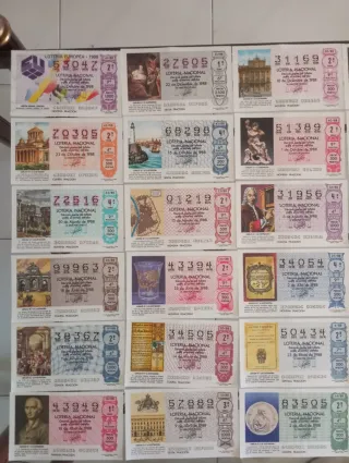 Lote de 50 billetes de Lotería Nacional del año 1988. Cada billete presenta un diseño único y conmemorativo. - Están en impecable estado, parecen recién compradas. - Incluye 50 billetes diferentes. - Diseños variados de 1988.