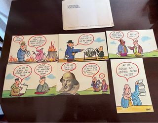 Conjunto de 5 postales vintage del artista Pablo, datadas en 1981. Cada postal presenta una ilustración cómica con texto. Ilustraciones de la serie “Instantáneas de aficionados” fue encargada por el Servicio Nacional de Loterías (actual Loterías y Apuestas del Estado) hacia 1981, con el objetivo de promover la compra de décimos mediante el humor gráfico. Firmadas por Pablo (José Luis López Vázquez), ilustrador y humorista gráfico español activo principalmente entre los años 60 y 80, muy reconocido por su trabajo para publicaciones y organismos oficiales.