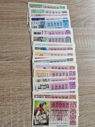 Colección de billetes antiguos y más modernos de la Lotería Nacional. Dispongo de décimos desde el año 1970 hasta ahora en la actualidad 2025, tengo años completos y con distintas numeraciones ( no son solo los que tengo en las fotos) TENGO BILLETES ENTEROS O DÉCIMOS SUELTOS!!! Si buscas alguno/os en concreto no dudes en preguntarme y visitar mi perfil !!!! 😊