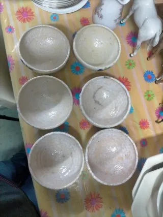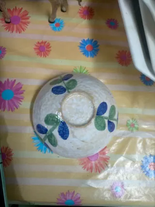 Conjunto de cuencos con un diseño floral característico de los años 70. - Estilo vintage. - Decoración con motivos florales. - Ideal para coleccionistas o para añadir un toque retro a la decoración. Pintados a mano testura rugosa pero suave al tacto acabado artesanal lo que le hace especial . Tiene pequeños defectos debido a la antigüedad.