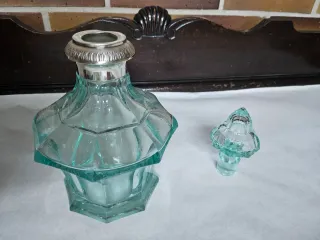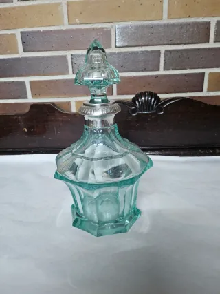 Preciosa licorera de cristal con detalles metálicos, que evoca la elegancia de mediados del siglo XX. - Diseño facetado en cristal. - Tapa y cuello de plata ornamentados. - Color verde agua. Muy muy bonita esta tal cual se ve en las fotos El estado es perfecto no tiene nada