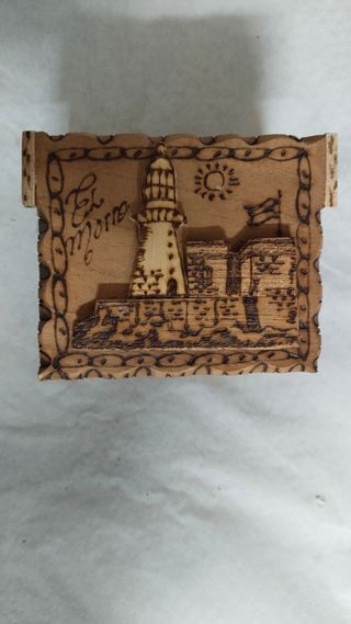 Souvenir de Cuba con un diseño grabado de El Morro en Cuba. Ideal para guardar pequeños objetos. - Grabado detallado de El Morro, un faro y el sol. - Bordes decorados con un patrón de cadena y festoneado. - Hecha de madera.