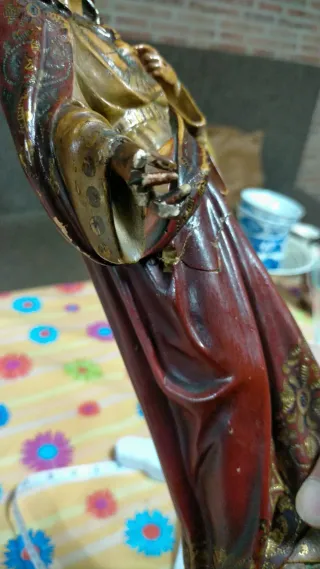 Figura religiosa del Sagrado Corazón de Jesús. - Detallada representación de la figura. - Colores vivos y acabados dorados. - Base de madera para exhibición. Figura realizada en pasta de madera siguiendo el mismo proceso artesanal des de 1880, ojos pintados y está decorado a mano.Tamaño: 42cm<br>Tipo de decoración: 1P Policromada - La imagen se decora a mano en pan de oro falso viejo y patinado, se busca un tono a oro gastado , falta La aureola y tiene varios defectos Necesita Ser restaurada