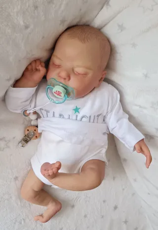 Bebe reborn artesanal de vinilo y cuerpo de tela. Tiene un pequeño defecto en el pie (burbuja defecto del vinilo),pero no está roto. Pesa 1,700 y mide 45 cm aprox.Usa la talla 0.