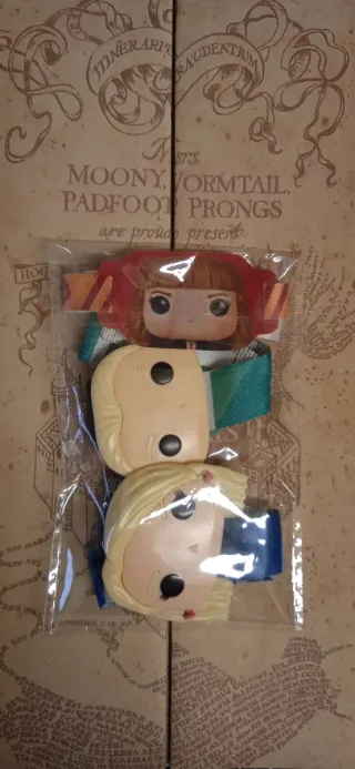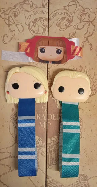 Accesorios de la primera colección de Harry Potter provenientes de Kinder Joy. Ideales para coleccionistas. - Figura de personaje femenino rubio con pendientes de fresa. - Figura de personaje masculino rubio. - Cintas de tela con los colores de las casas de Hogwarts.