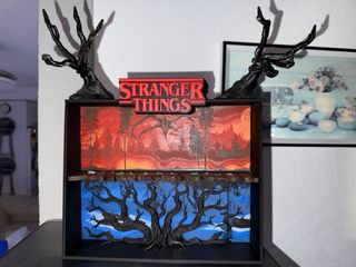 Este es un stand temático de Stranger Things, inspirado en los coleccionables de Kinder Joy. - Diseño detallado con elementos icónicos de la serie. - Incluye accesorios. - Ideal para coleccionistas y fans de Stranger Things. No incluye las iluminación led pero si la cavidad lo puedes instalar de cualquier bazar