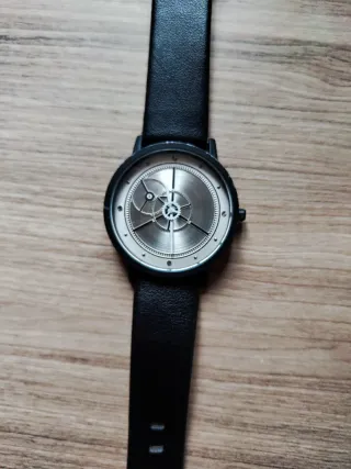 Elegante reloj de pulsera con correa de cuero negro y esfera metálica. - Diseño moderno y minimalista. - Correa de cuero. - Esfera con detalles mecánicos.