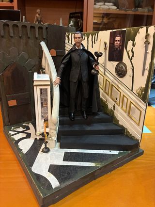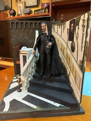 Diorama personalizado de Drácula, basado en Christopher Lee, en escala 1/12. Una pieza única para coleccionistas. - Figura detallada de Drácula. - Escenario de escaleras y castillo. - Incluye accesorios como candelabro , vitrina y retrato, hecho y pintado a mano, figura nueva marca Neca de escala 1/12, 18 cm de alto, con capa de tela, incluye otra cabeza y tres manos intercambiables, todo nuevo.