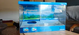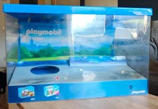 Vitrina expositora de Playmobil, ideal para coleccionistas. Muestra un diseño inspirado en un paisaje urbano con el logo de Playmobil. Medidas 58x37 y 38 cm de alto - Estructura de plástico rígido transparente y chapa azul. - Base con detalles gráficos Plataforma redonda giratoria, pero no tengo el motor que lo movia