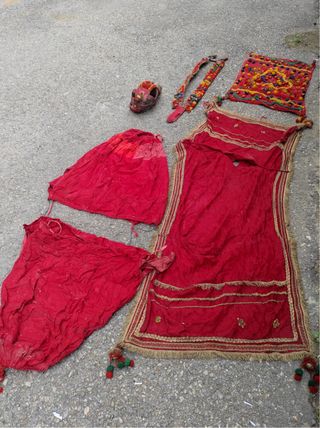 Conjunto de elementos decorativos de color rojo, ideales para adornar caballos. - Incluye una máscara, una pieza para la cabeza y una manta. - Adornos con flecos y pompones de colores.