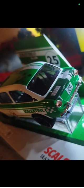 Coche de Scalextric del Seat 850 Club. - Modelo con dorsal 25. - Decoración verde y blanca. - Incluye matrícula SCX 2025.