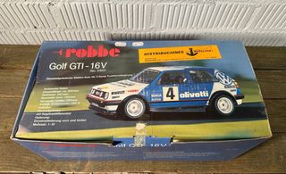 Coche radiocontrol Robbe Golf GTI-16V a escala 1:10. De stock de tienda, años 90. Las dos últimas fotos corresponden a un modelo igual ya montado. - Modelo: Golf GTI-16V - Escala: 1:10 - Tracción: Motor eléctrico 540 S - Transmisión: Engranaje recto con diferencial de engranajes cónicos - Suspensión: Independiente delantera y trasera - Longitud: aprox. 400 mm - Distancia entre ejes: 243 mm - Ancho de vía delantero/trasero: 150 mm